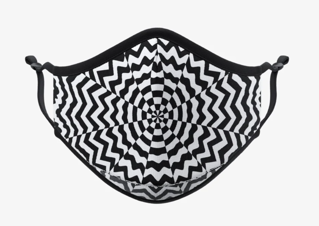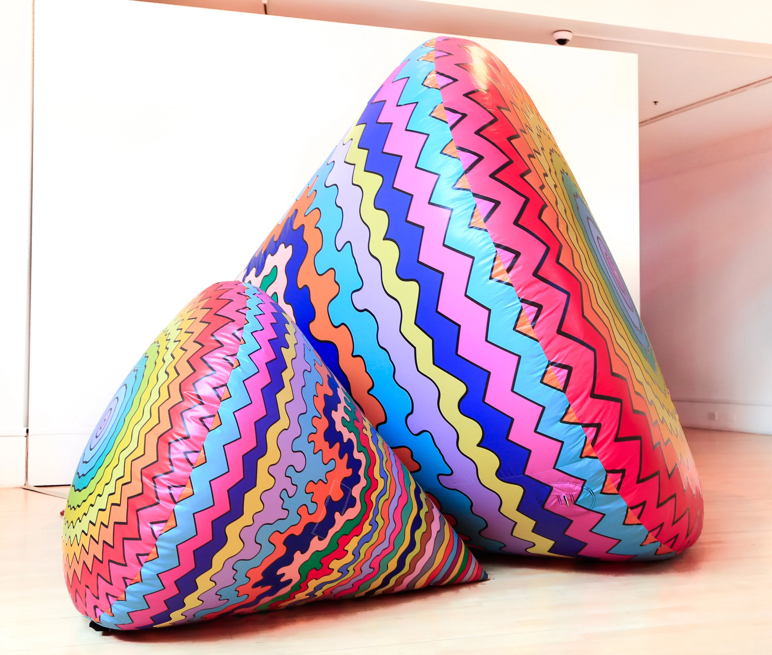 Dimensionality features Stark’s colorful paintings, sculptures, installations, and a mural. As the exhibition title suggests, Stark plays with painting and sculpture by adding or accentuating the dimensions of her work, often transforming two-dimensional objects into three-dimensional ones. Squared, composed of thirty-five square sheets of powder coated aluminum, inhabits the wall like a painting. Each sheet, painted a different color, has a concentric square fold that extends outside the picture plane towards the viewer. Stark adds an extra dimension to Ethereal Vortex by projecting subtle moving waves of light onto the surface of the painting using Lightform, a device that projects augmented reality. The waves strobe and pulsate, creating the illusion of something static coming to life. Gradial Continuum transforms as the viewer walks around the work. One side of the sculpture features a full color gradient and a mirrored surface on the other. From the front, it appears as a cohesive composition of concentric circles, while from the side, it resembles an elongated sequence of rings.